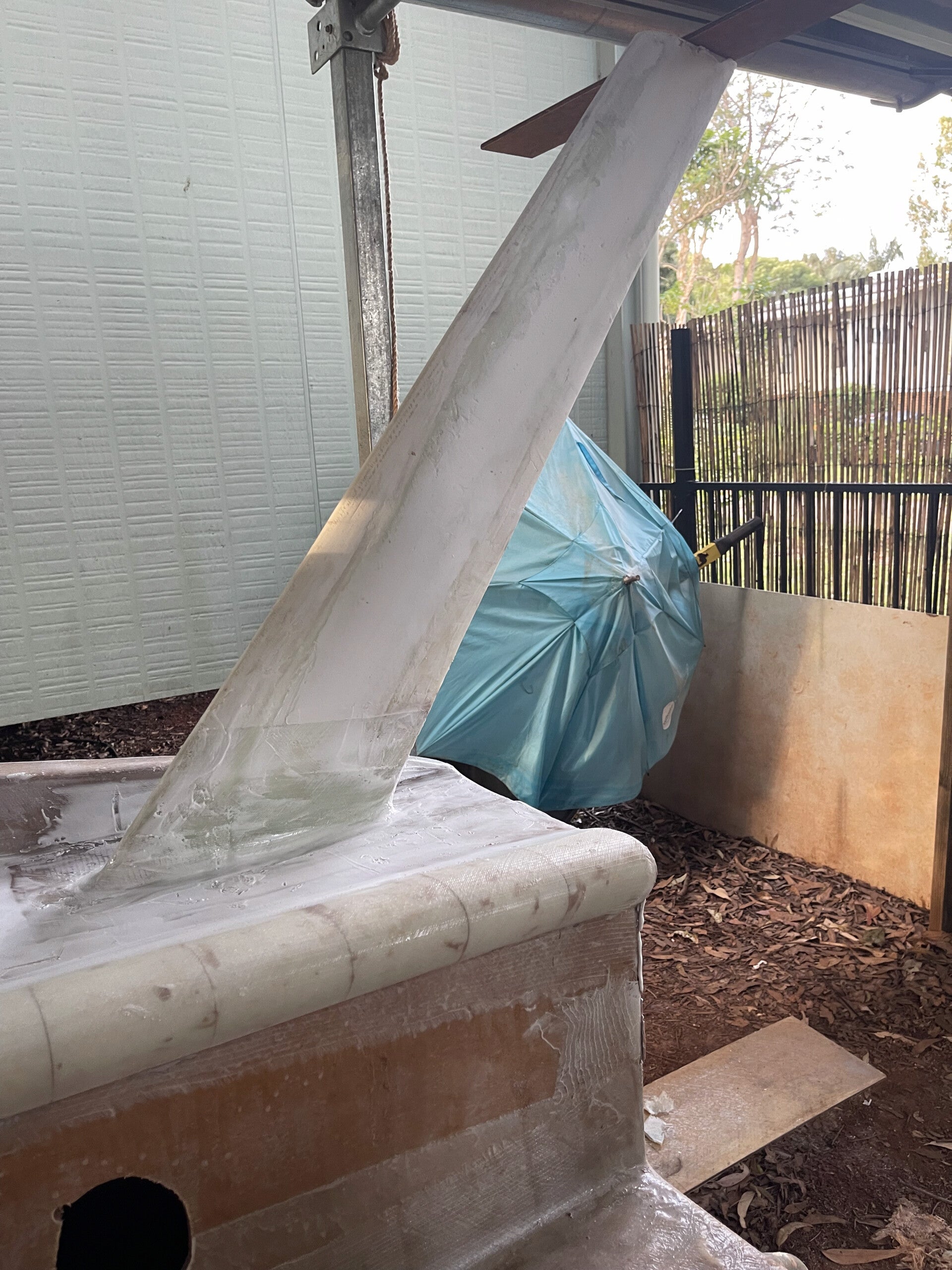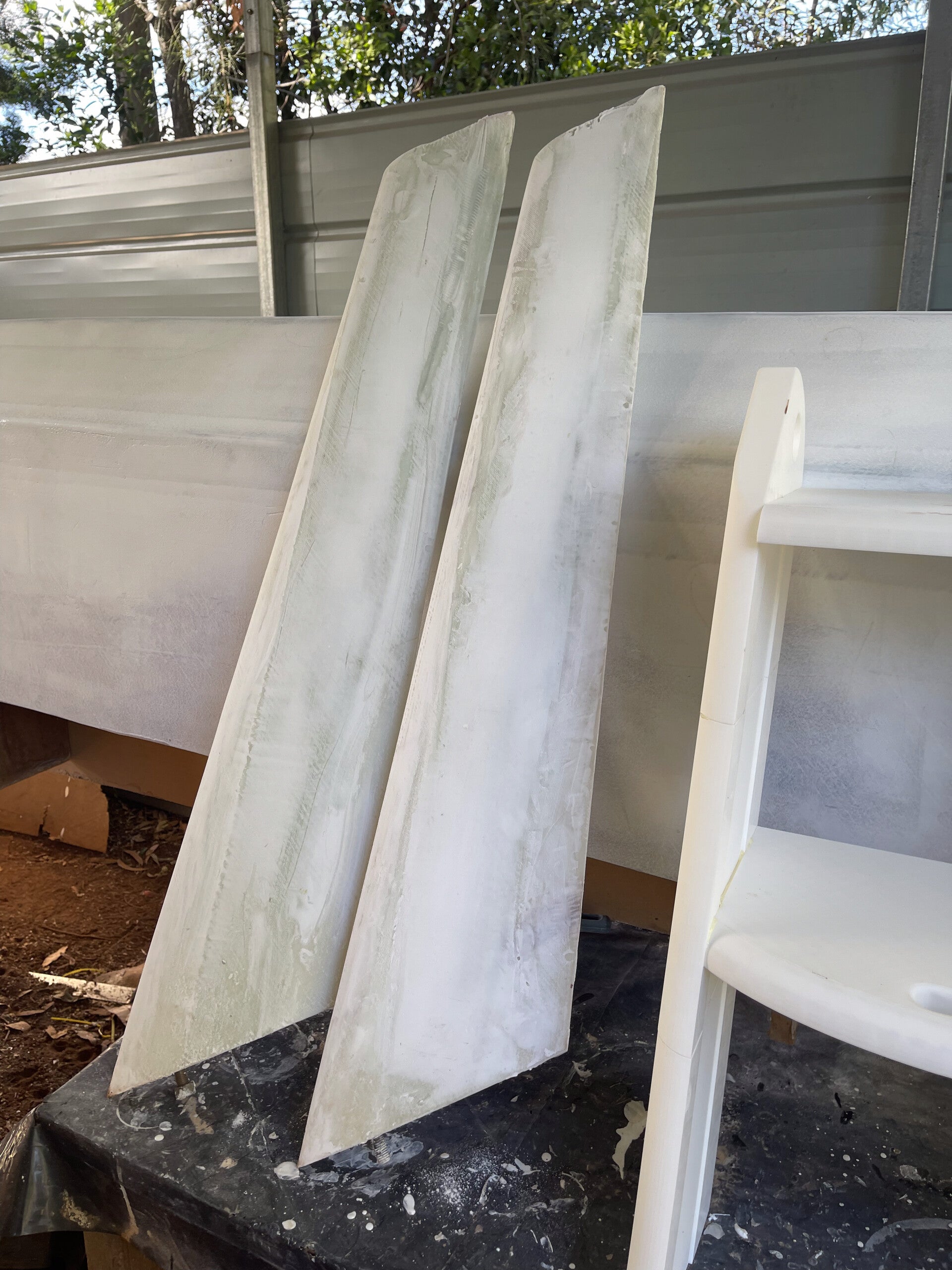 Fairly simple to get right. There is a 100mm (W) x 5mm (D) channel along each side of the leg. This is filled with 3 x 100mm x 400gsm biaxial tape. Channels are then filled, and then the entire leg is glassed with 400gsm biaxial. I then fillet and glass to the boat again with 2 x 400gsm biaxial tape.